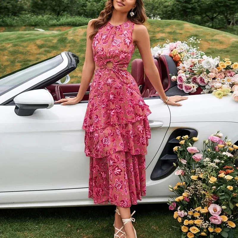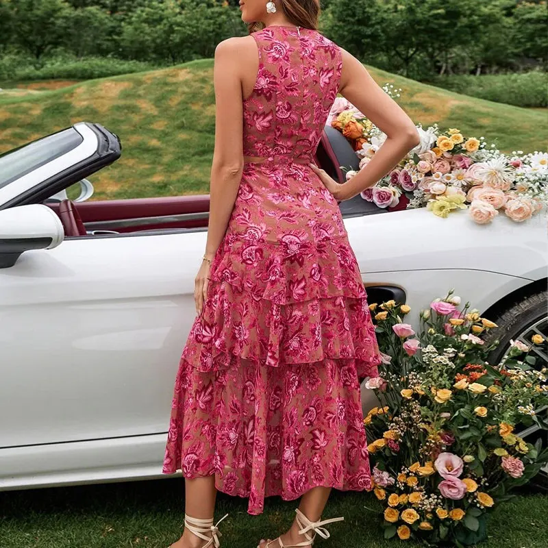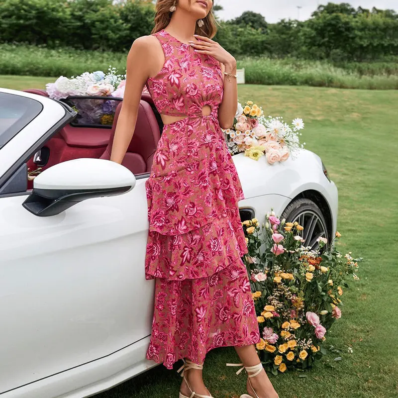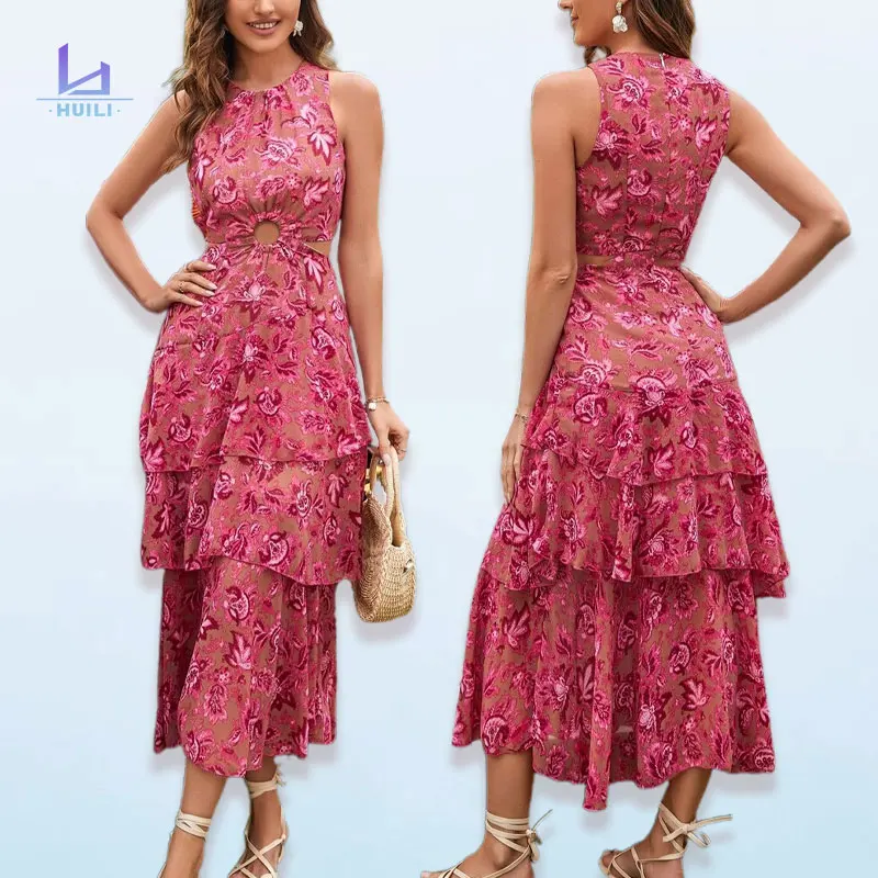 Huili Manufacturer 2025 New Style Fashion Designer Cut Out O Neck Sleeveless Boho Floral Lace Luxury Vintage Casual Red Dress